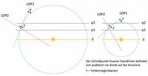 Folgt nun eine zweite Beobachtung, aus der eine zweite Standlinie LOP2 hervorgeht, dann wird der Schnittpunkt der Standlinien als Schiffsort berechnet. Dieser Schnittpunkt kann aber gerade dann, wenn Höhengleichen mit kleinen Durchmessern, also großen Höhen vorliegen, weiter weg von der Kreislinie selbst liegen, wie das im oberen Bild auf der rechten Seite gut zu sehen ist.