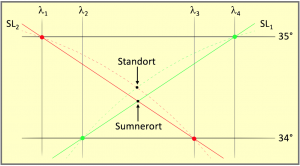 für dieselbe Beobachtung berechnet. Die Schnittpunkte der Längen mit den geschätzten Breiten sind somit Punkte genau auf der Kreislinie des Höhenkreises, der auch als Kreis gleicher Höhen oder einfach Höhengleiche bekannt ist. Werden diese beiden Punkte mit einer Geraden verbunden, so erhält man eine Sehne und nach deren Verlängerung zu beiden Seiten eine Sekante. Diese Sekante ist die Standlinie, auf der das Schiff irgendwo stehen sollte. Eine grafische Standortbestimmung ist also ohne zusätzliche Berechnungen nicht möglich. Die Formeln in diesem Fall lauten für den ersten Schnittpunkt: